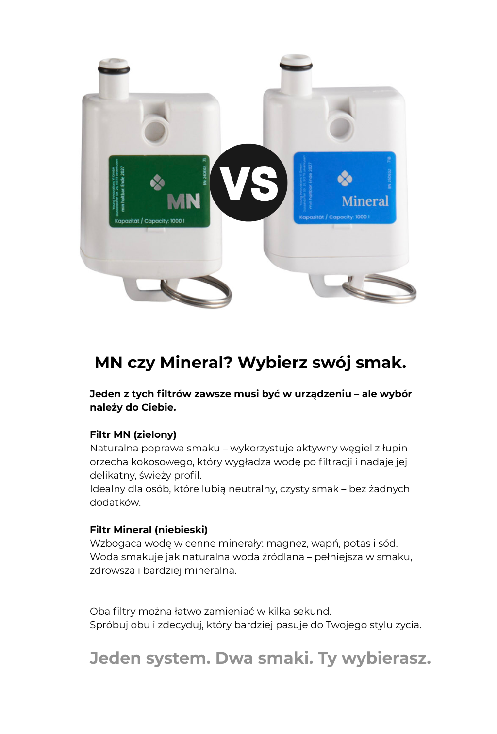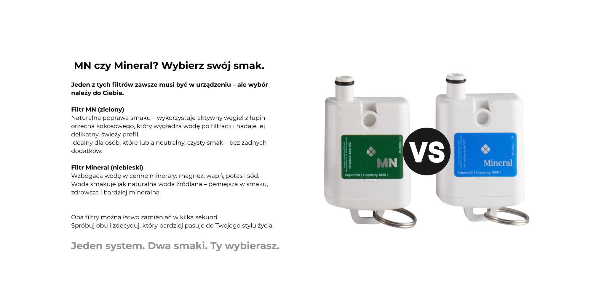 Dodaje wodzie niezbędnych minerałów: magnezu, wapnia, potasu i sodu – dla pełniejszego smaku i zdrowia. Woda po filtrze Mineral smakuje jak naturalna woda źródlana, ale prosto z Twojej kuchni.